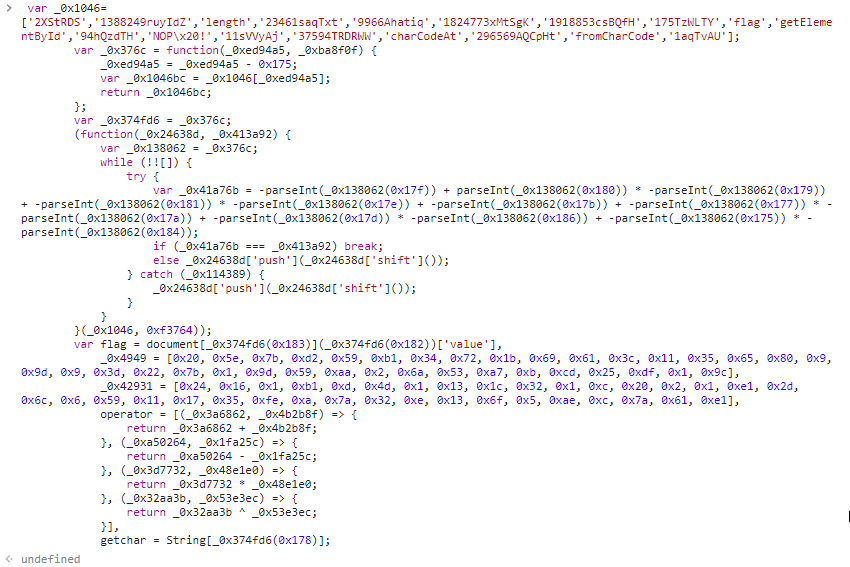 var _0x1046=['2XStRDS','1388249ruyIdZ','length','23461saqTxt','9966Ahatiq','1824773xMtSgK','1918853csBQfH','175TzWLTY','flag','getElementById','94hQzdTH','NOP\x20!','11sVVyAj','37594TRDRWW','charCodeAt','296569AQCpHt','fromCharCode','1aqTvAU'];