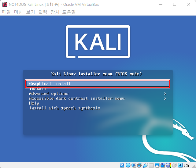 7. 시동디스크의 load에 성공하면 이 글에서 설치할 Kali Linux의 경우 Installer menu가 나온다.