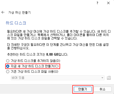'지금 새 가상 하드 디스크 만들기' 를 선택하고 '만들기' 버튼을 선택한다.