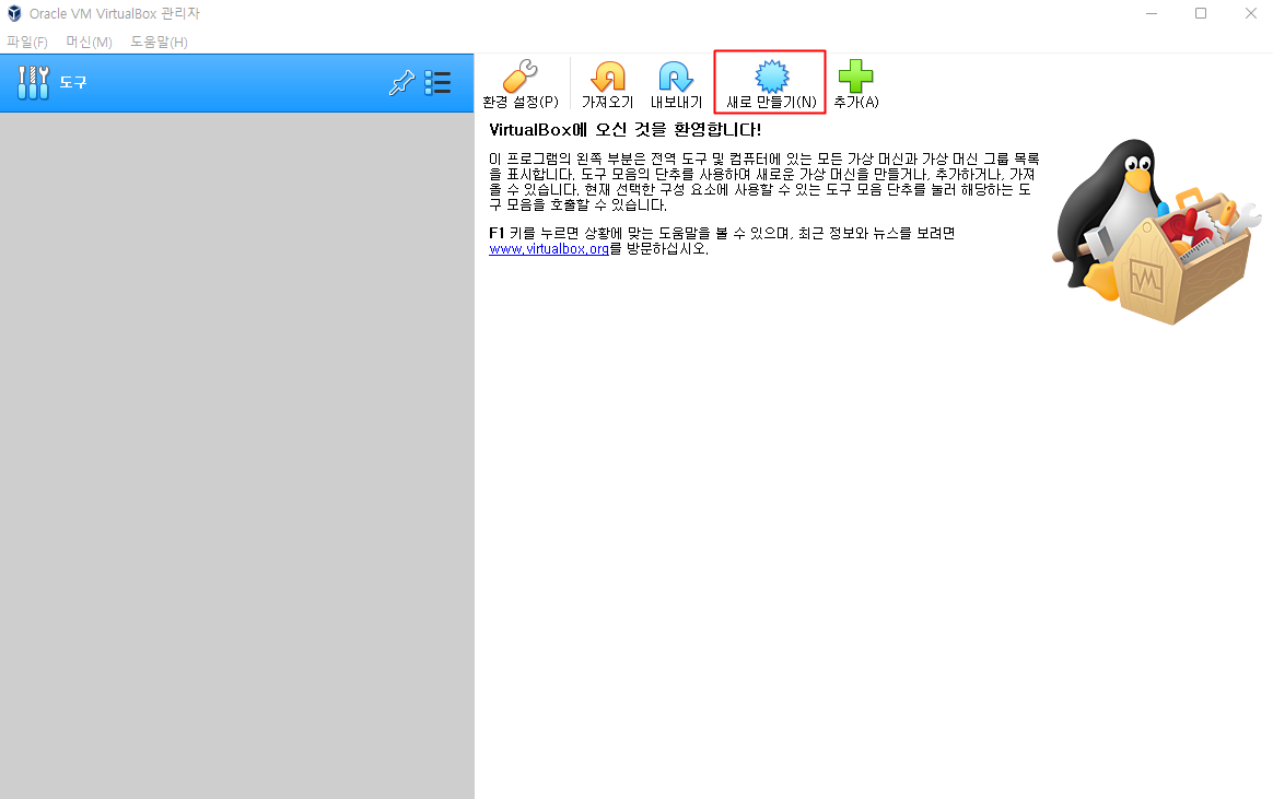'새로 만들기' 버튼을 통해 가상머신을 만들어줄 수 있다. 물론 가져오기 기능을 통해
