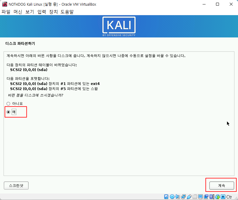 바뀐 사항을 디스크에 쓰기'를 선택하고 '예'를 선택해 가상 디스크에 Kali Linux 설치를 진행한다.