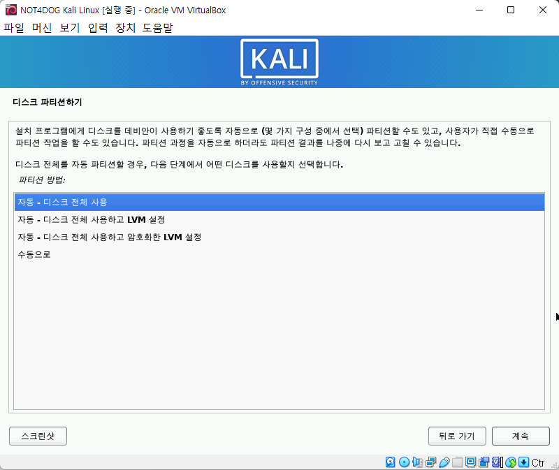 '자동 - 디스크 전체 사용'을 선택하고 반드시 앞에서 생성한 가상 하드디스크를 선택해야한다. (VBOX HARDDISK)