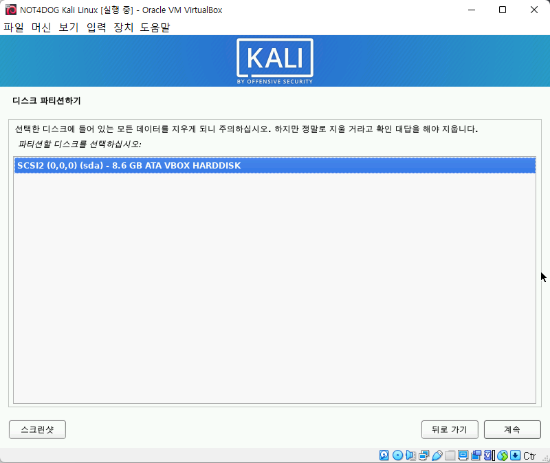9. 기본설정들을 마치고 나면 Kali Linux를 설치 할 하드디스크를 선택할 수 있다.